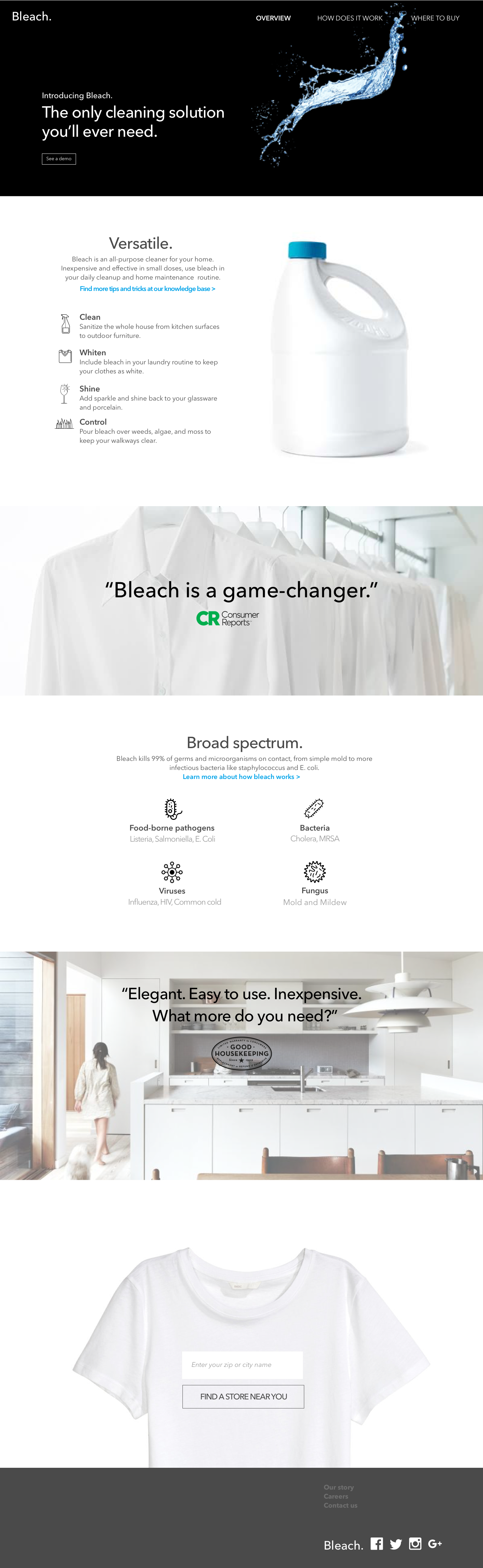 This was part of a design challenge that I competed in 8 hours. It's a landing page for bleach in a world where no consumer has ever used bleach. I focused primarily on the versatility of bleach, with a wide range of uses, and also the effectiveness in killing a broad spectrum of germs and pathogens. I chose to make this page minimalist and crisp to showcase the simplicity and elegance of an all-purpose highly effective cleaner.